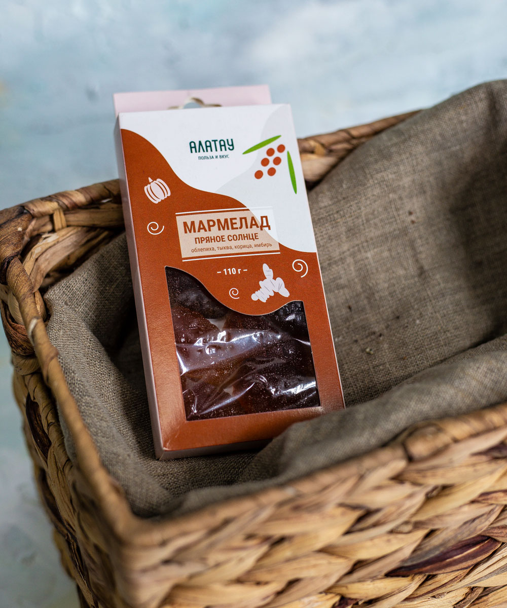 Состав мармелада богат на функциональные ингредиенты – пюре тыквы, сироп из облепихи, пряности имбирь и корица, пектин.