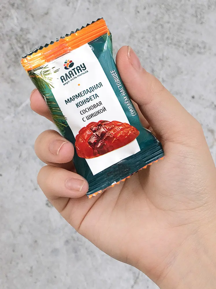 Состав мармелада «Сосновый с шишкой» – сахар, сироп из сосновой шишки и сосновые цукаты, патока, пектин, лимонная кислота, растительное масло, пчелиный воск.